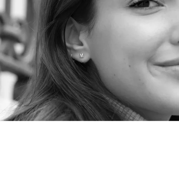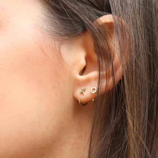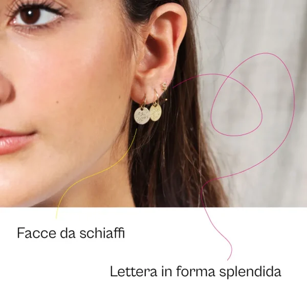 Gold tiny hoop earrings with mini letters.