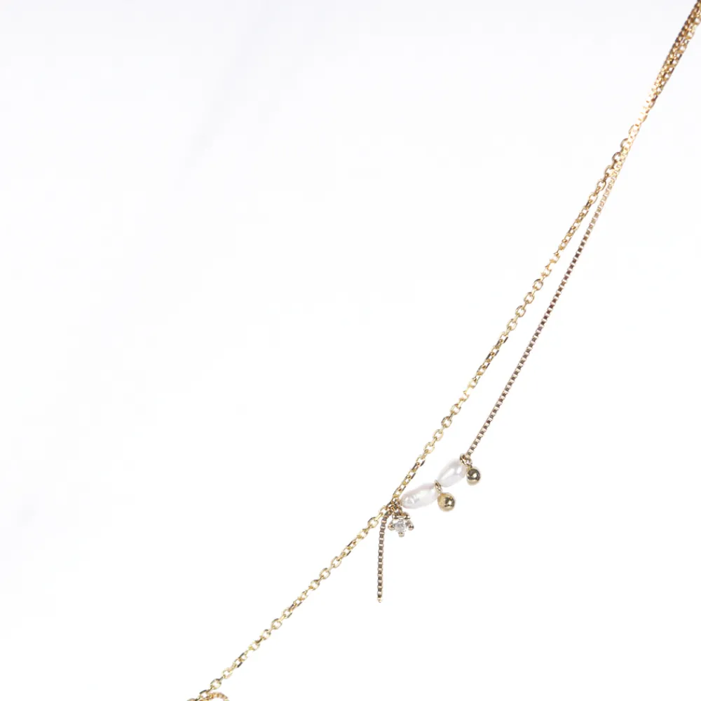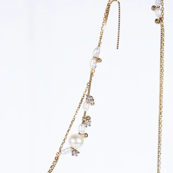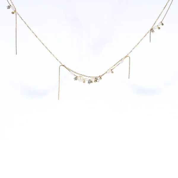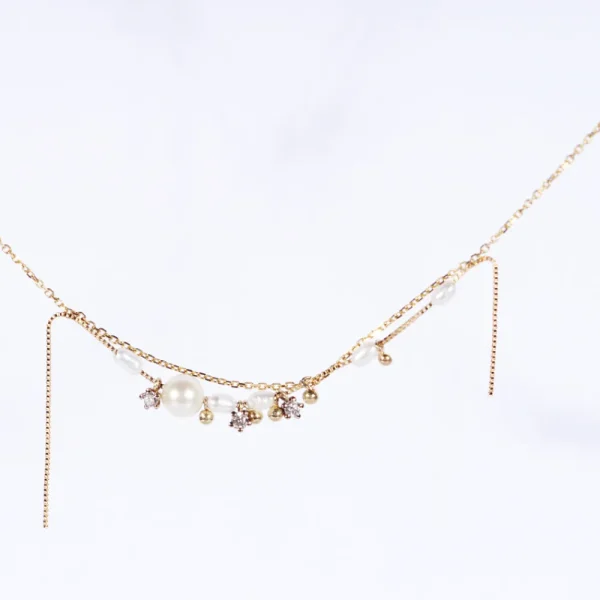 9k yellow gold dainty necklace handmade with two intertwined and fringed chains, white pearls in different shapes and five brilliant-cut white diamonds (tot. 0,08 ct | Colour: G | Clarity: VS1).