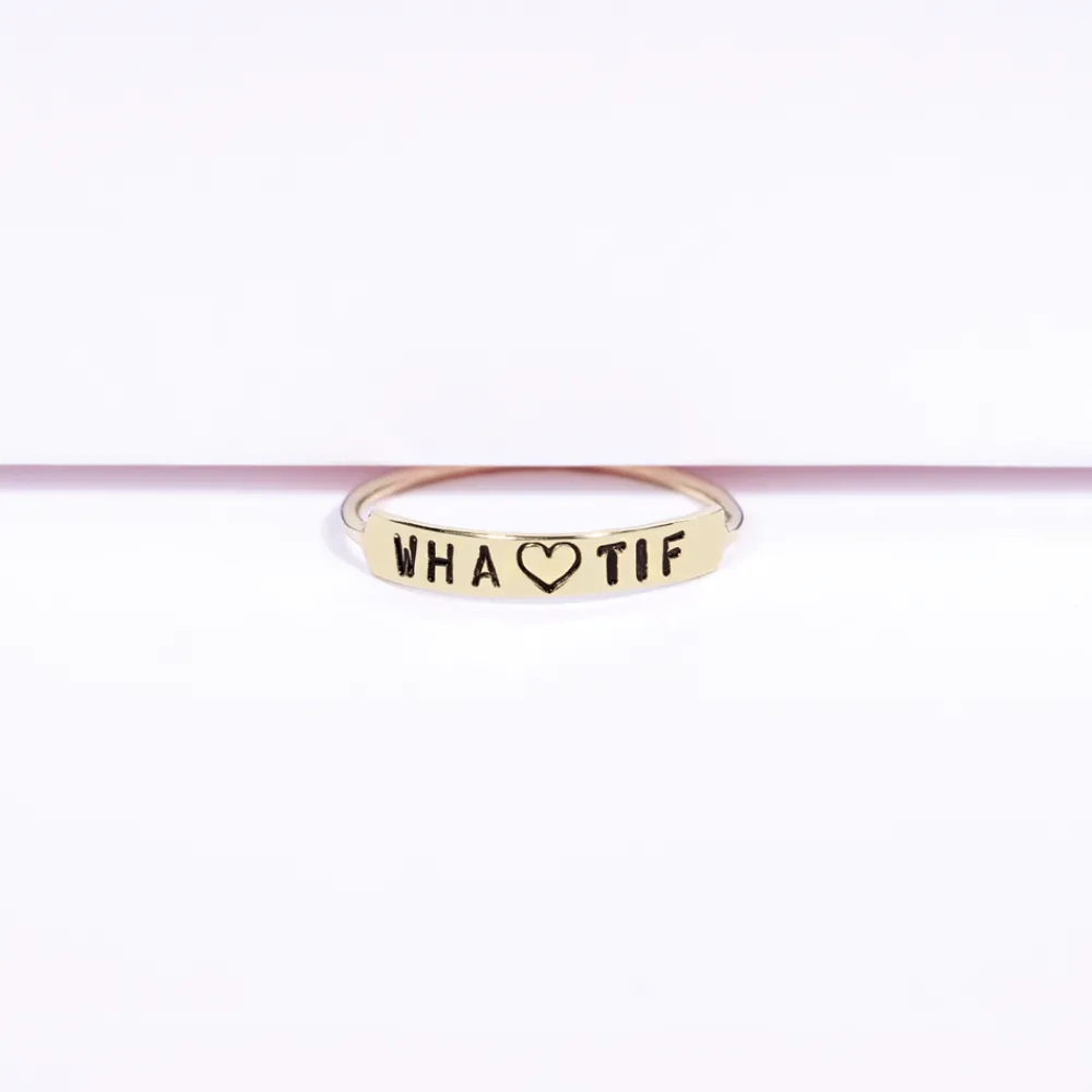 9k yellow gold tiny ring with rectangular curved plate (about 3 mm high), with the text “WHA♡TIF” stamped on and then blackened.