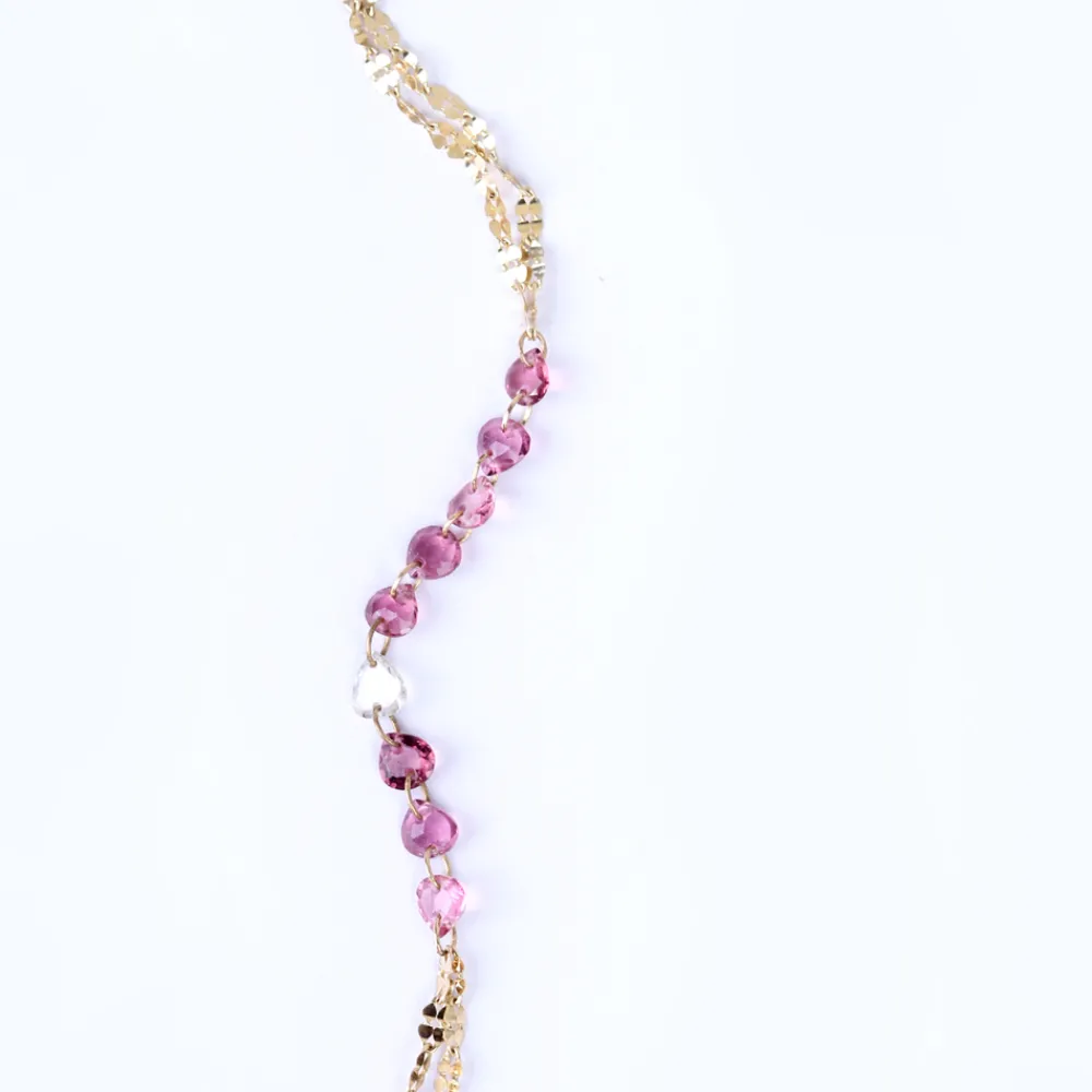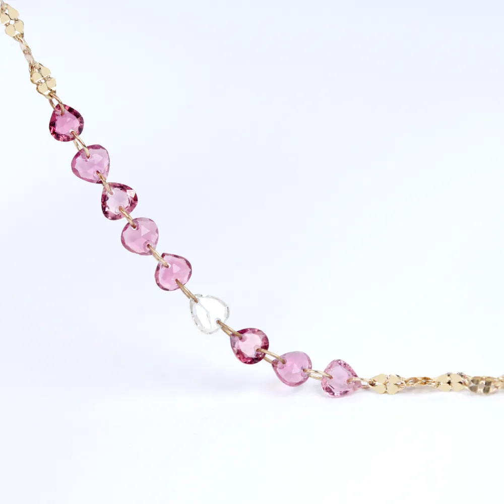 In the middle 9 irregular and asymmetrical stones: one diamond and 8 tourmaline drops in the shades of pink.