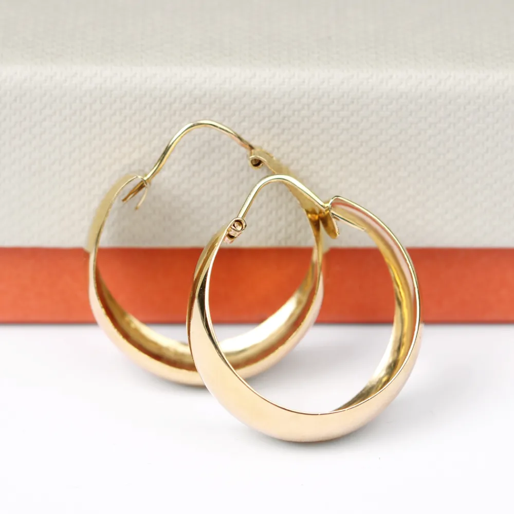Very light wide hoop earrings, entirely handmade in polished 9k yellow gold.