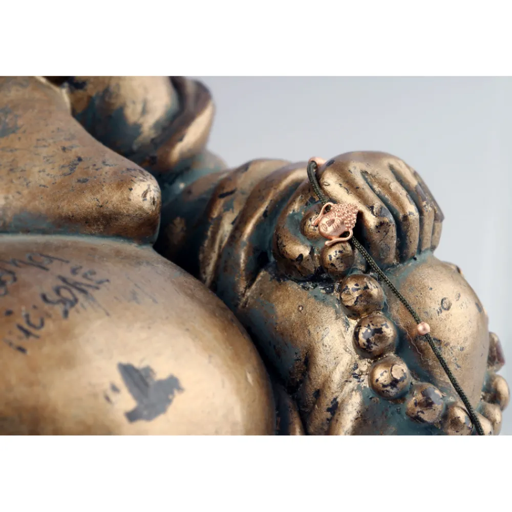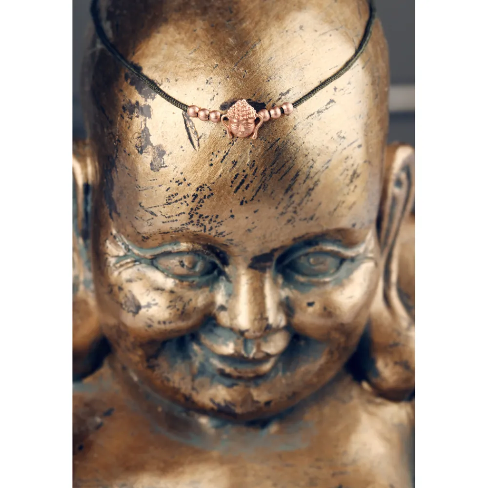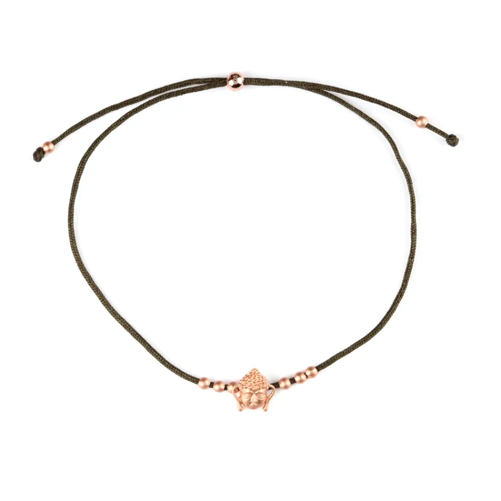 Simple bracelet with 925 pink silver beads and buddha shaped element (7 mm high), set on dark hunter green polyester cord.