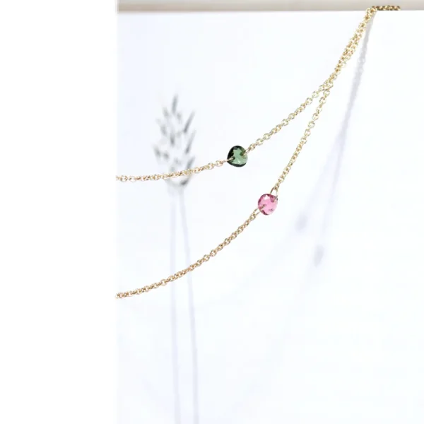 Purchasing “Secret”, you will receive a digital coupon to weld an anklet made of 9k yellow gold dainty rolò chain with one irregular stone drop of pink tourmaline.