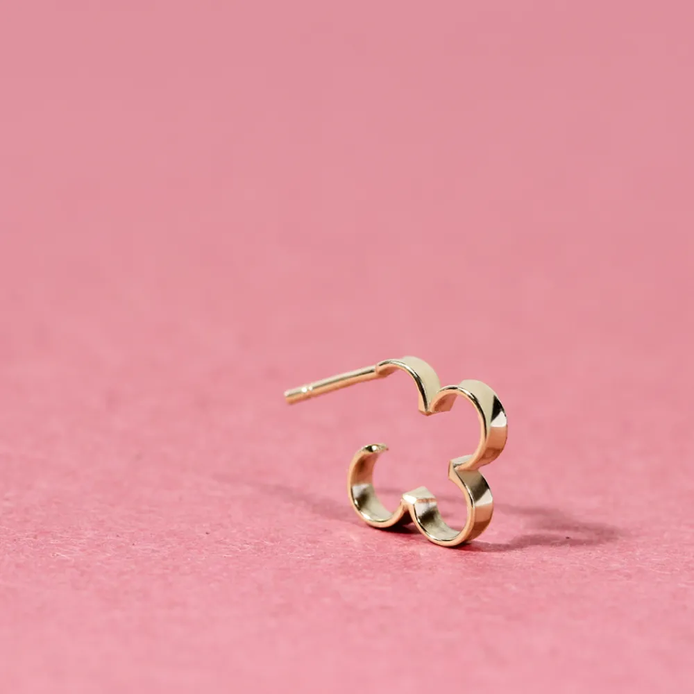 Flower stud open hoop earrings, entirely hand-made in polished 9k yellow gold. Always different from one another.