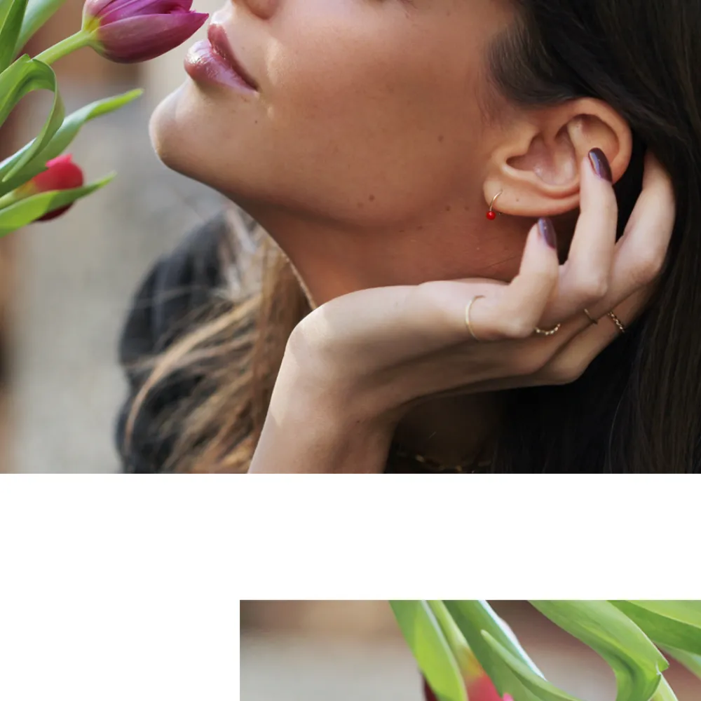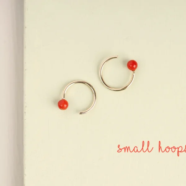 Minimalist mini hoop earrings with red coral beads.
