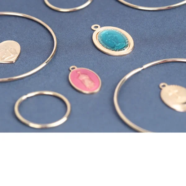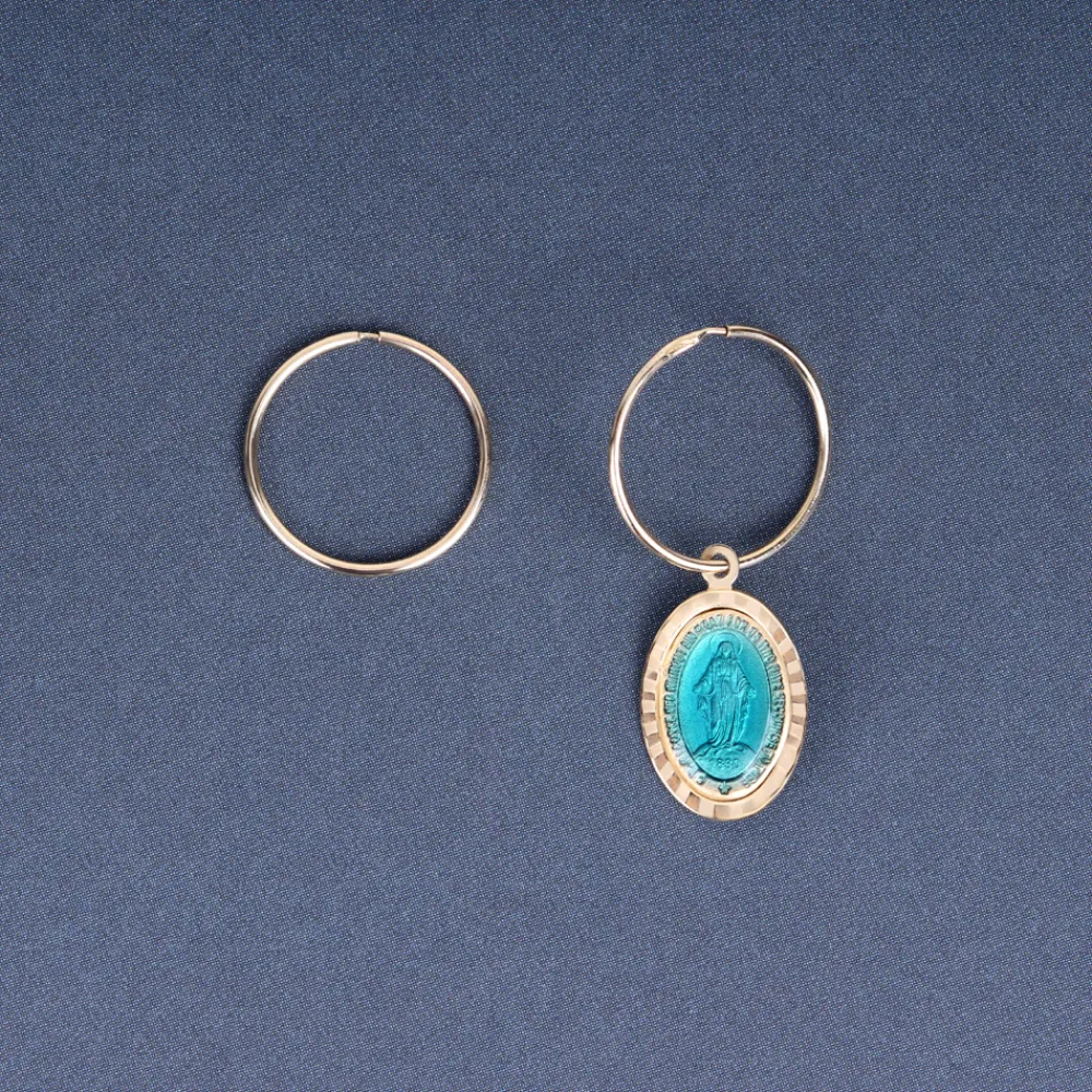 Thin hoop earring in 9k yellow gold (diam. 15 mm) with Miraculous Medal of Our Lady of Graces, covered by light-blue enamel.